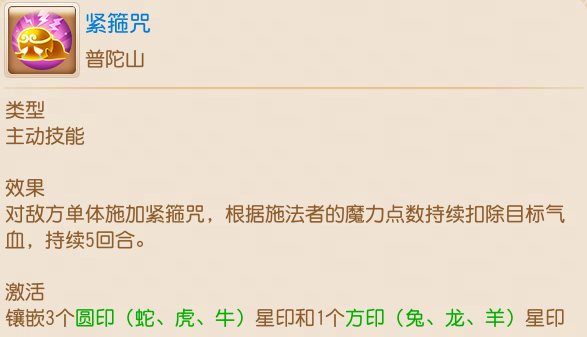 如果挂有紧箍咒的目标被五行咒击中,会刷新持续回合数并额外造成施法者魔力乘以1的固定伤害。
