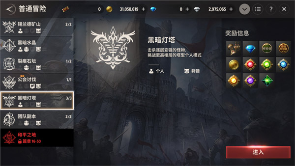 通过[菜单] – [普通冒险] – [黑暗灯塔]界面可进入黑暗灯塔。