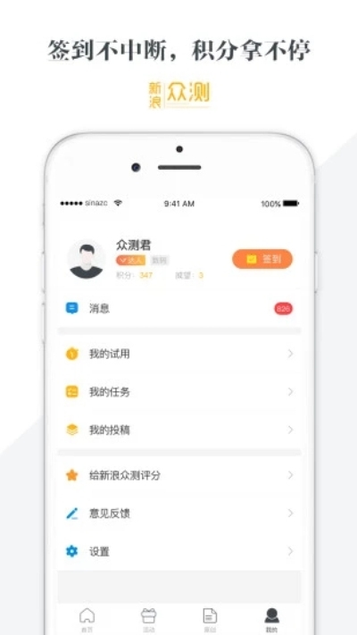 通过新浪众测app,可以随时随地用手机进行签到,签到从此再也不会中断,积分也会越攒越多,积分商城众多好礼就等你去兑换!