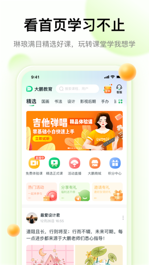 3、平台五个学院:“设计学院”“美术学院”“国画学院”“书法学院”“兴趣学院”涵盖多种热门课程