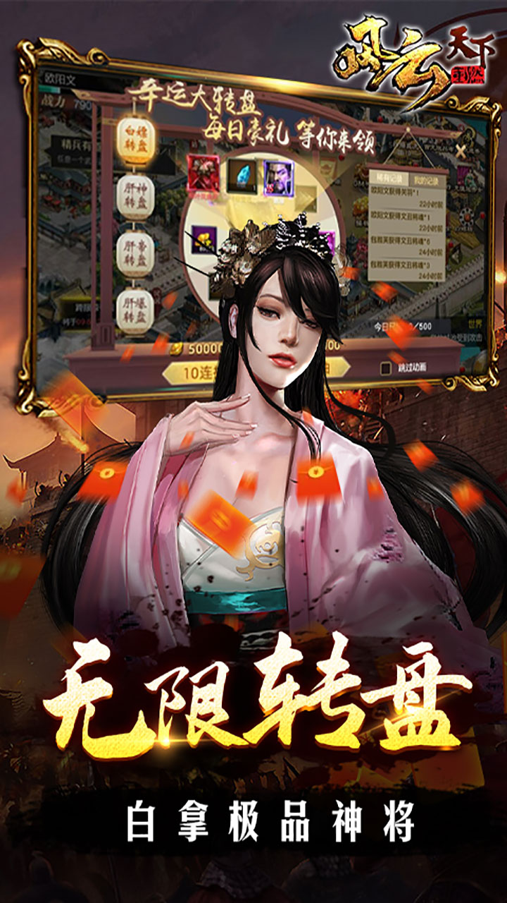 5、在华丽的战场争斗中,风云天下重燃手动释放名将特技,丰富效果、华丽特效,给你难以忘怀的战斗体验不!!但是,并不仅仅像普通的战斗卡牌类游戏那样,轻轻一点放大招。而是全程战斗都由你来掌控,手指轻轻滑动,便可指挥千军万马的驰骋,彰显君临城下的气派!!;豪华战场谁与争锋,千军万马尊你为王!如此大气澎湃的战场,怎能少的了万夫不当的你!