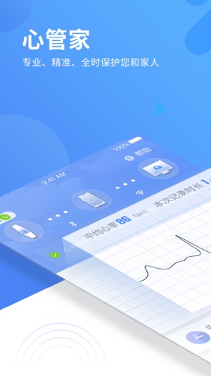心管家,实时监测,持续记录心电,随时随地查看;生成报告,权威医生在线生成分析报告;添加症状,实时记录症状,医生确诊更高效;心管家,专业、精准、全时保护您和家人;查看数据,日历式管理,轻松查看数据