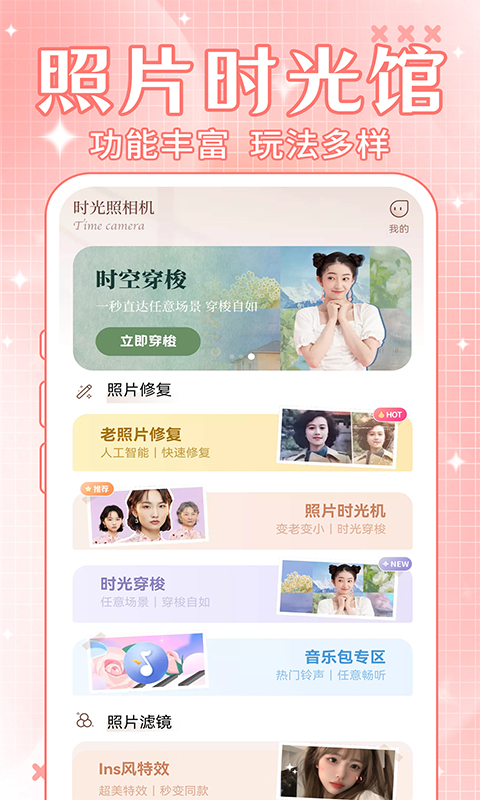 可以实现一键男女性别互换,性别转换,男女性别置换,快速换脸!照片时光馆不仅能够拍摄出各种富有年代感的照片,还能做旧正常的照片和老照片修复,采用AI智能算法,功能非常的强大