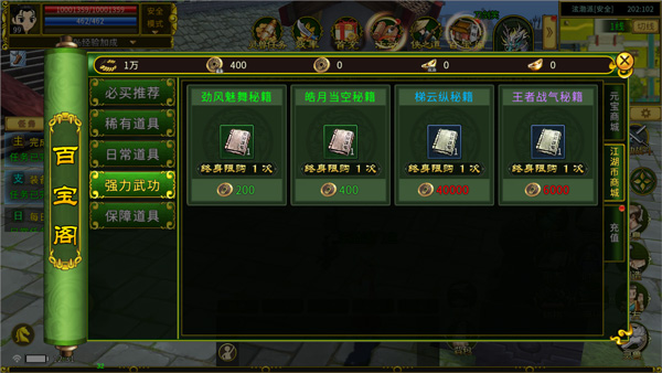 以上武功秘籍均可从【百宝阁】江湖币商城获取,秘籍在手,天下我有!需要注意的是学习新武功还需要达成一定的历练值,击杀野怪可获得大量的历练值。