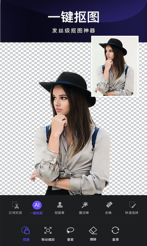 懒图一键抠图p图提供智能抠图功能,可以快速将图片中的主体抠出,方便进行后续的编辑和设计。
