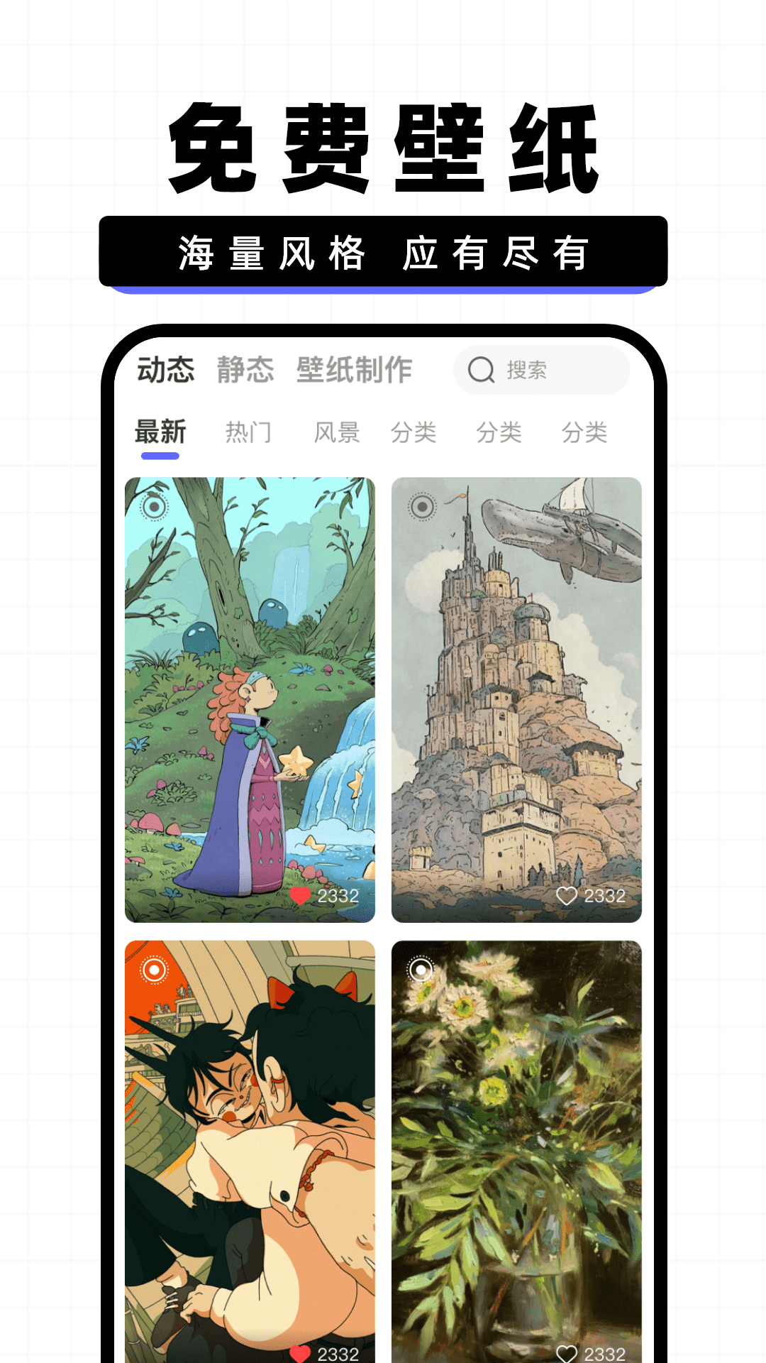 在App首页可以浏览热门、分类、最新等不同标签下的壁纸,也可通过搜索功能输入关键词查找特定主题的壁纸。