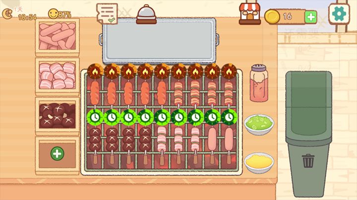 有多种口味的烧烤食材可供选择,玩家可以根据顾客的需求来制作不同的串串,吸引更多的顾客光顾。