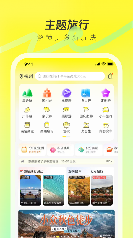 5、海量原创线路随时随地预定周边游、国内游、出境游、摄影游、亲子游、自驾游、户外游、同城会、定制游,限时特惠全新上线,每月推出超值爆款限时秒杀,超值抢不停