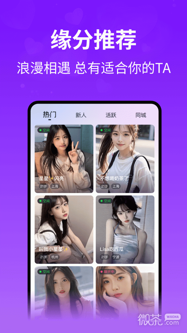 想要脱单的用户,赶快来想聊这款软件中偶遇自己的有缘人吧,这里所有的用户都是实名认证的,并且还上传了自己真实的照片,你可以根据他们的照片找到自己喜欢的另一半,可以让你快速的脱单了