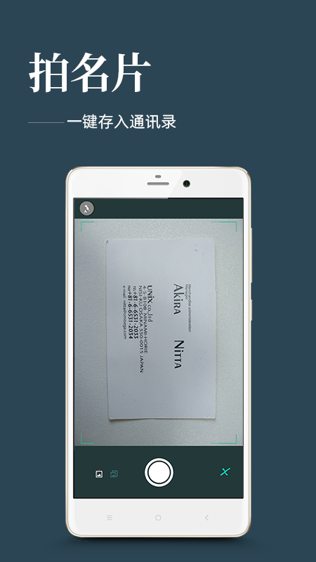 只需要拿手机打开软件对着对方名片一扫,对方名片上的信息便一字不差的保存下来,也可以设置自动保存通讯录里减少手动输入的麻烦