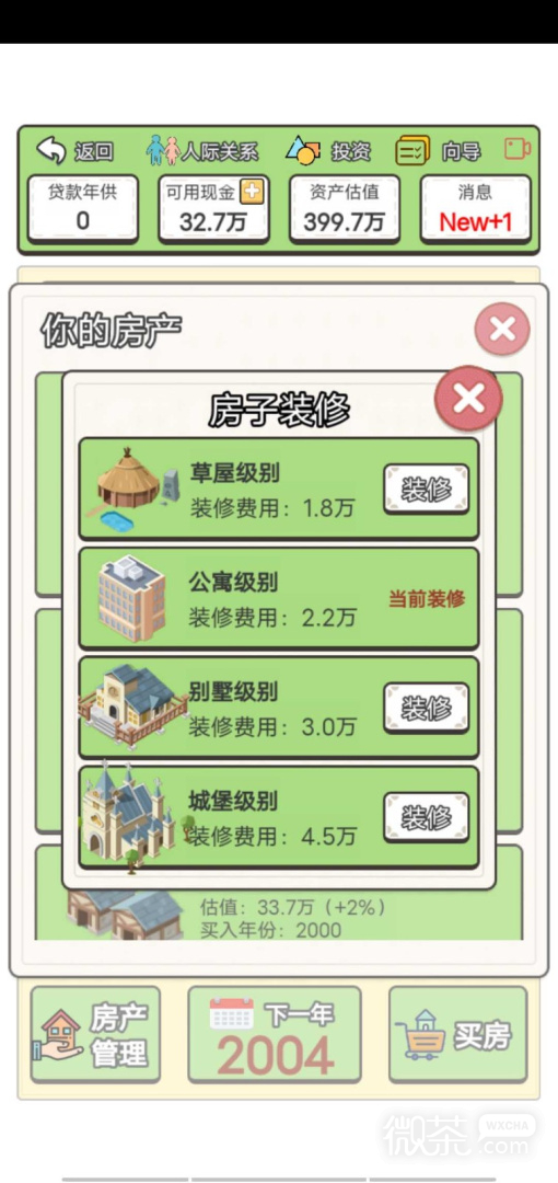 回到2000年买房子是款很有趣的模拟买房游戏,游戏背景回到2000年,通过您的经营能力,以及手上有的资产,不断的去经营,买房,扩大收益,然后成为大亨,欢迎来回到2000年买房子体验