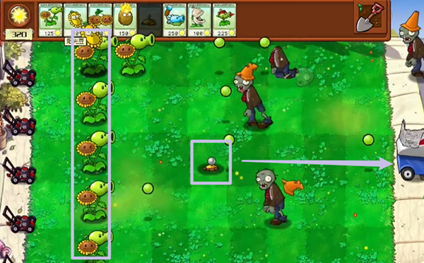 2、开局不要直接建造二百多阳光的射手,我们建造向日葵射手就可以打掉普通僵尸,火力不够的一路放土豆雷,性价比最高。