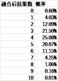 2、融合后的技能只会是两只母体有的技能,按照游戏的概率公示,每个技能留下来的概率为40%,那意味着如果是两只5技能的宠来融合,最可能留下4技能,但如果你运气好,也可能留下6个以上的技能,这里我放出两只5技能合宠后的技能数及其概率值