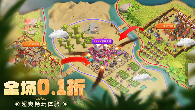 游戏中融合了养成、策略和社交元素,玩家需要发展自己的部落并招募各种类型的蚂蚁,组建强大的军队,与其他部落展开对抗,夺取资源和领土。
