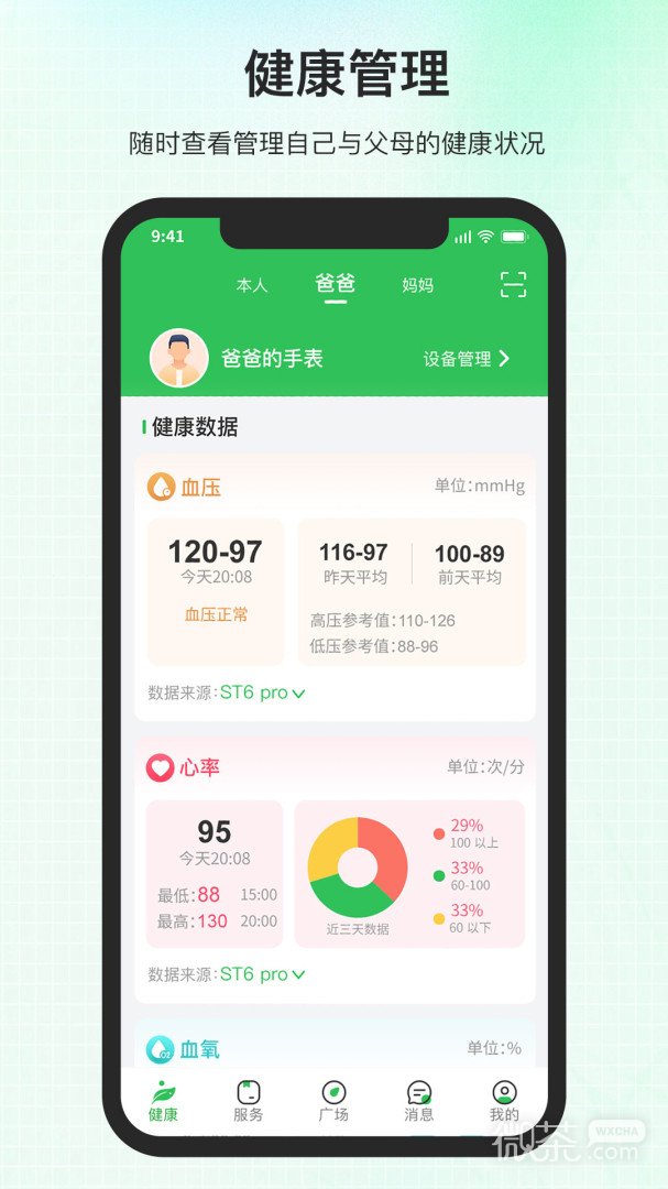 4、远程实时查看父母心率、血压、血氧、体温、睡眠、步数等数据