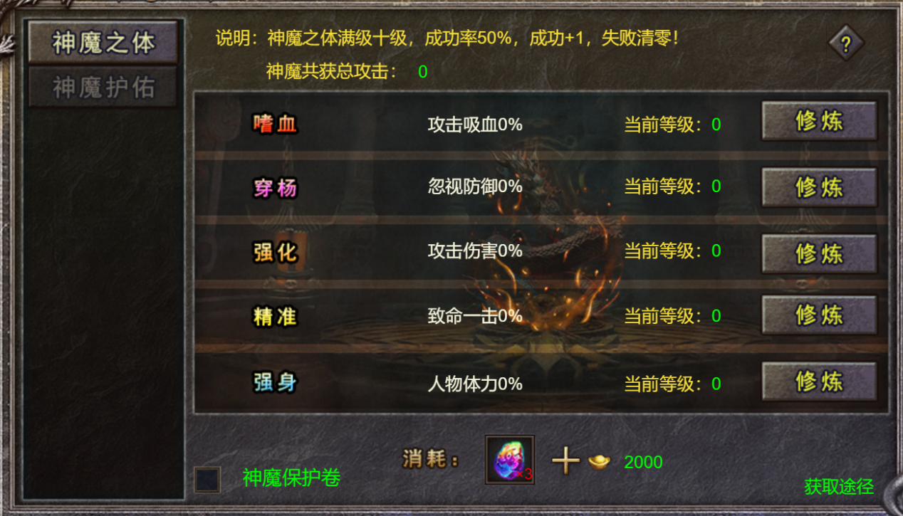 修炼需要消耗灵魂晶石加元宝,初始成功率为50%,每次修炼可以提升1点祝福值,10点祝福值增加0.5%的概率,100%则必定升级成功。勾选神魔保护卷失败不会降级。