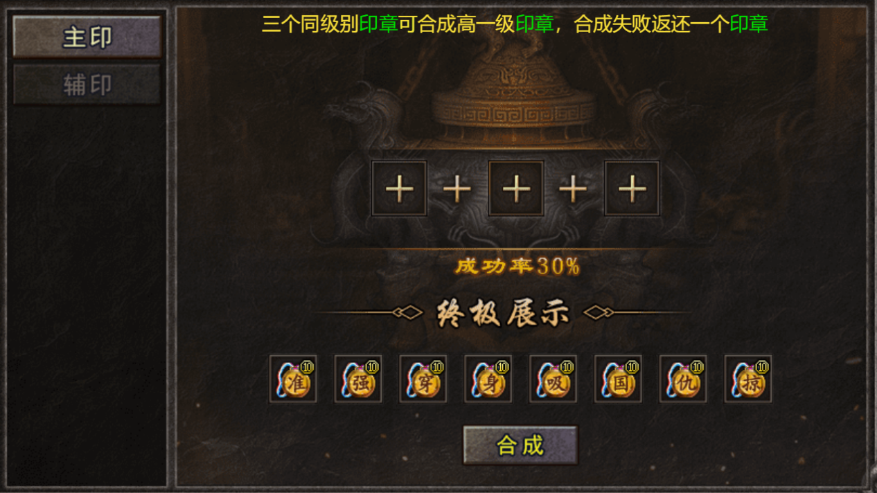 5-9级主印或辅印3个可以有30%几率合成对应更高等级的主印或者辅印,合成失败返还一个印章