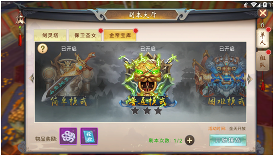 金帝宝库是游戏中提供金币来源的单人副本玩法,有多种难度,难度越高,奖励金币越多。