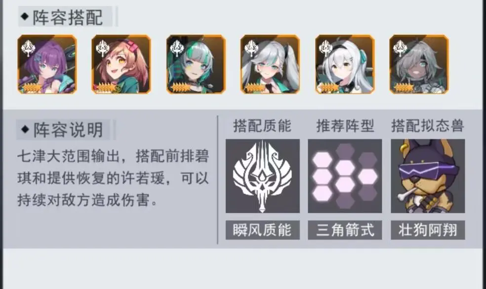 游戏内推荐阵容的查看方式:点击游戏要员角色右上角的档案图标来查看推荐阵容,同时配备阵容说明,搭配质能, 推荐阵型以及搭配拟态兽,下面为泷莹队的一些搭配思路,可以作为补充参考。