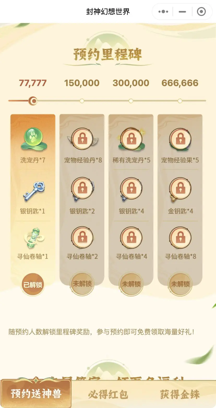 里程碑全解锁资源:洗宠丹*7,银钥匙*7,寻仙卷轴*15,金钥匙*4,稀有洗宠丹*5,宠物经验丹*8,宠物经验果*5