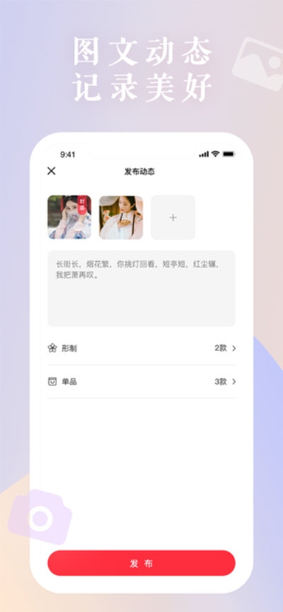 3、发布图文:支持多图发布,分享你的汉服穿搭