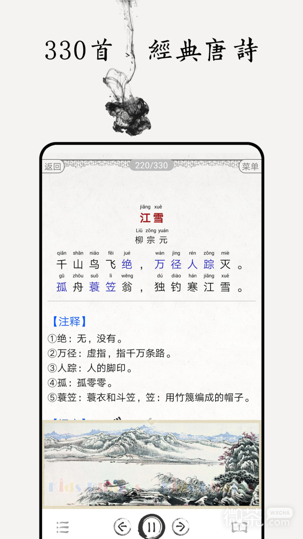 唐诗三百首图文是由爱好国学的团队所制作,收录近330首经典唐诗。带你领略唐诗魅力,弘扬传统文化,团队成员衷心希望诗词内容能得到家长、老师、学生的共同发扬和分享