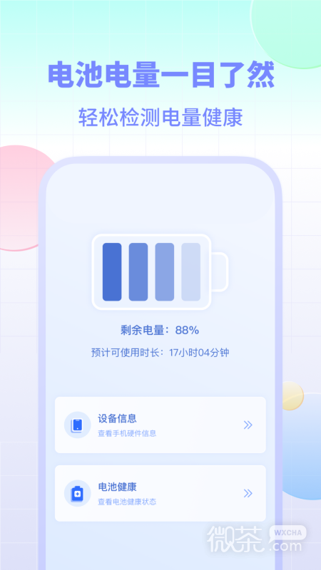 电池小组件是电池管理专家,可轻松检测电池健康,找出并解决影响电池健康的问题,比如常见的电池发烫、续航时间变短、充不进去电等。软件可以展示电池相关信息,比如电量、容量、电压、温度等,会全天检测电池健康,高温或者电量不足时会提醒用户降温或者充电