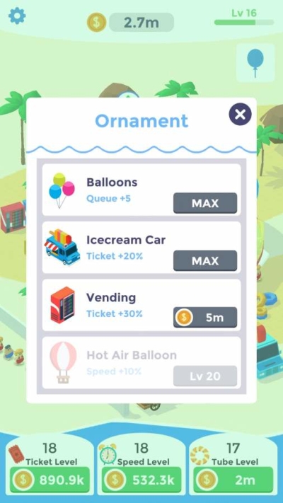 《放置水上乐园》是一款卡通风格的模拟经营类手游。玩家将经营着一家水上乐园,炎炎夏日,最适合玩水。玩家可以按照自己的想法设计乐园的设备,多块场地等待你的解锁。为了赚取更多的金钱,升级设施,你需要想办法吸引更多的游客。游戏为放置类玩法,轻松简单。快来尝试吧!