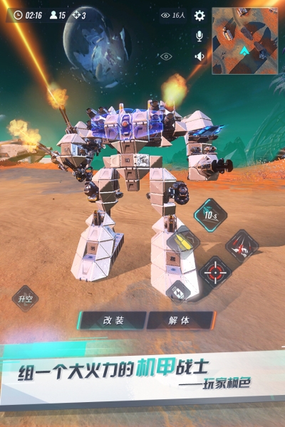 在《重装上阵九游版》 ,你是让人敬仰的太空工程师。用你天马行空的创造力,组装出独一无二的战斗机甲!驶过环形山口,飞越宇宙星空,和全世界玩家联机比赛,开启精彩绝伦的太空冒险!