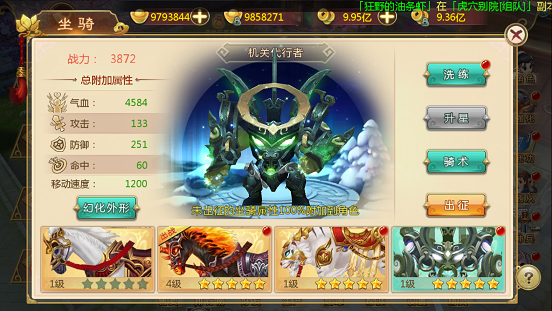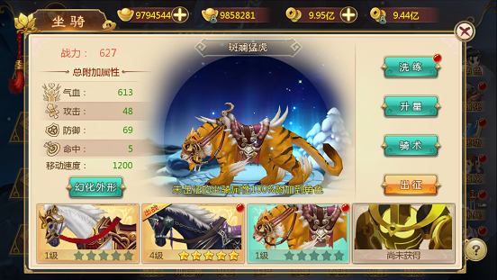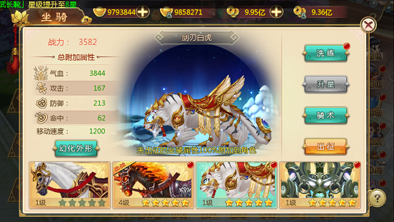 三种可成长坐骑都有洗练、升星、骑术,幻化外形选项。