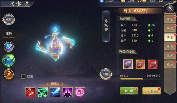 玩家通过三界争夺和九重天阙以及参加其他运营活动等途径能获得一定的法宝灵晶以便用于提升法宝等级,越高级的法宝解锁的技能越多,在BOSS之家和参与活动获得的对应魂石可用于提升法宝的加成属性。