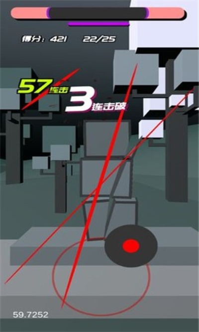 时间斩击画面十分简洁,你将在第一视角下拿起手中的刀剑去砍碎面前所有的建筑物,玩起来代入感十足而且特别解压,当你成功通关之后就能获得金币去购买其它的武器了,当中间的按钮和圆环重叠的时候点击就能达到完美评价,得分相对而言也更高一些,连击同样会有加成