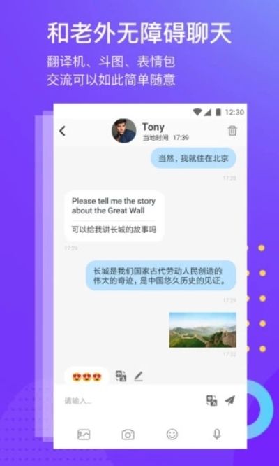 ·交流功能,在与语伴交流过程中,可以支持文字、图片、表情、语音消息等多种交流方式;