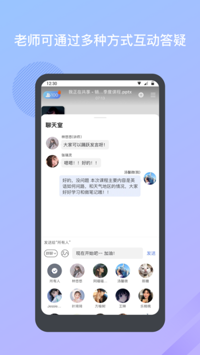 【视频语音实时同步】支持最高9路音视频,全员同步。主讲人一键开关视频、语音、互动,把控会议流程。