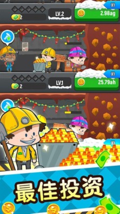 轻松解压的放置游戏,玩法简单易懂。玩家只需雇佣经理人和矿工,即可实现自动化赚钱,无需占用太多时间,即可成为矿产大亨哦!