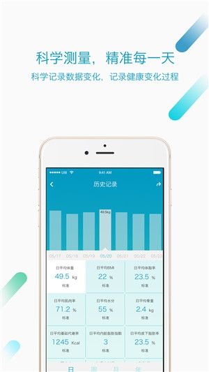 利用BIA生物电阻技术,以体重以及身体固定数据(年龄、身高)借助科学公式计算,计算出BMI、体脂率、肌肉率、水分、骨重、基础代谢率、蛋白率等18项身体数据,帮助你管理身体。