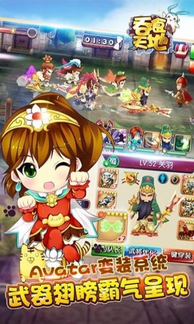 《吞食天地》是一款3D卡牌战棋策略手游。 游戏使用卡通渲染的武将模型与3D动作捕捉技术相结合,遵循原著,加入恶搞爆笑剧情;同时,玩法上有别于传统的战棋游戏,以极致的智能操作及运筹帷幄的策略战术,并以3D滑动旋转的视角控制开启了立体式全息战棋策略时代。
