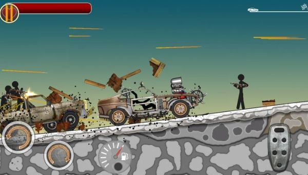 )))在途径的路上会遇到其他火柴人的射击,利用汽车装备的武器将它们击杀。