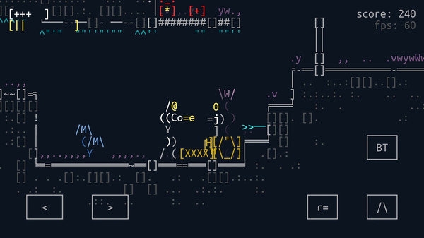 具有ASCII艺术和程序生成的动态平台程序。游戏在充满各种对手的无尽地牢中进行。进一步深入,摧毁其路径上的所有事物。