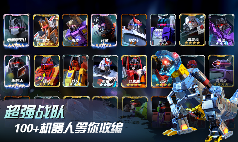 以擎天柱、威震天、大黄蜂为首的100+角色等你收集!组队闯关,解锁超炫合体金刚!