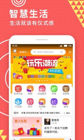 优品街整合了上千种日常生活服务项,以用户需求为主导,告别“人找服务”的繁琐过程,动动手指,城市尽在你掌中,优品街为用户精挑细选,整合打造了高质量社交版块,内容化分享平台,资讯、圈子、社交、小视频、直播,精彩内容目不暇接,通过优品街发布技能和服务,互帮互助实现价值。