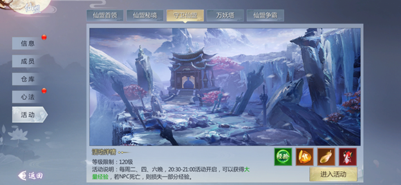 达到等级后可进入,每周二、四、六晚,20:30-21:00活动开启,可以获得大量经验,若NPC死亡,则损失一部分经验。