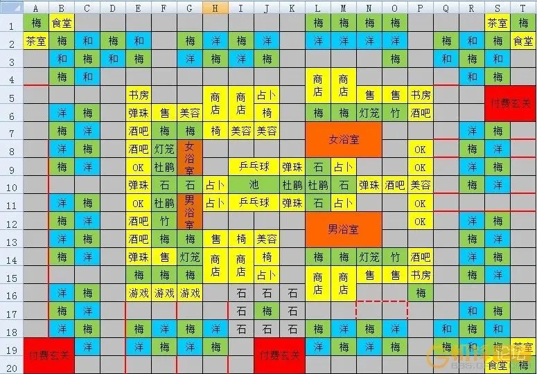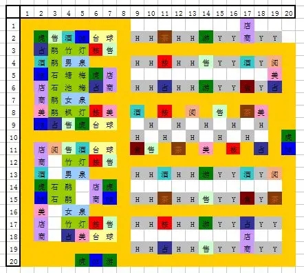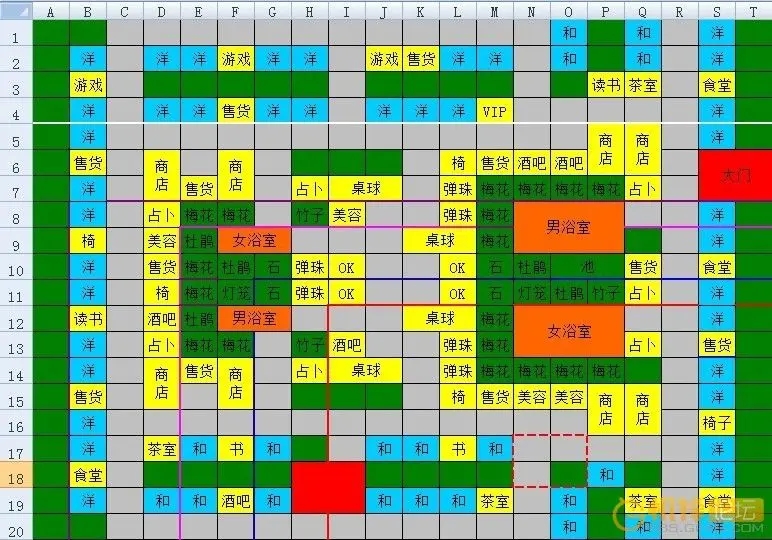 一周目的小温泉布局~空白的格子随便放,客房不够放客房,再随便放些商店也是可以的。(PS:图中 店商-小卖部 虎-游戏机 游-游艺机 鹃-映山红 酒-咖啡厅 OK-歌厅 售-自动贩卖机 )旧图有的翻译不同。