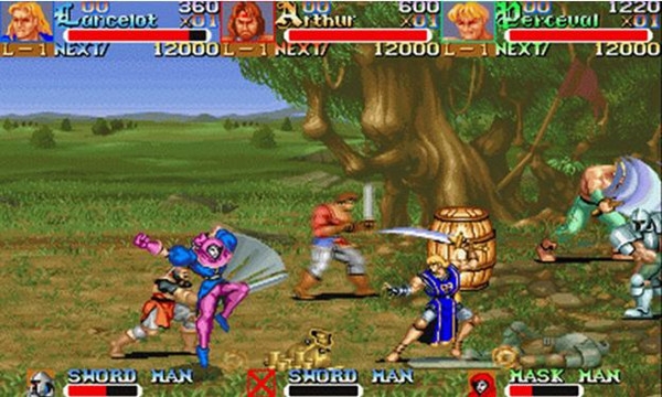 《圆桌骑士街机版》这款大人气作品,背景取自中世纪的亚瑟王传说,人物设定相对成功,给人留下极深刻的中世纪印象,系统方面除了有坐骑,有耗血绝招以外和其他作品有很大其他,首先圆桌武士没有摔投的概念,可能由于所有人物全都使用剑器的原因,为了弥补失去摔投以后攻击力的下降,特地增加了重斩的概念。