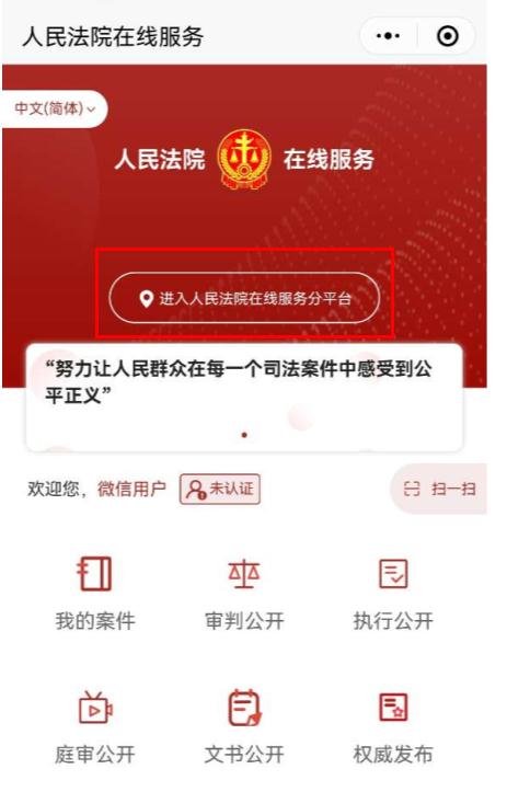 用户进入小程序后,点击“进入人民法院在线服务分平台”。