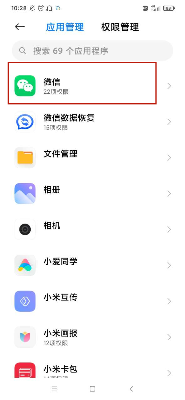 进入权限管理之后点击“应用权限管理”,找到微信选项并点击。