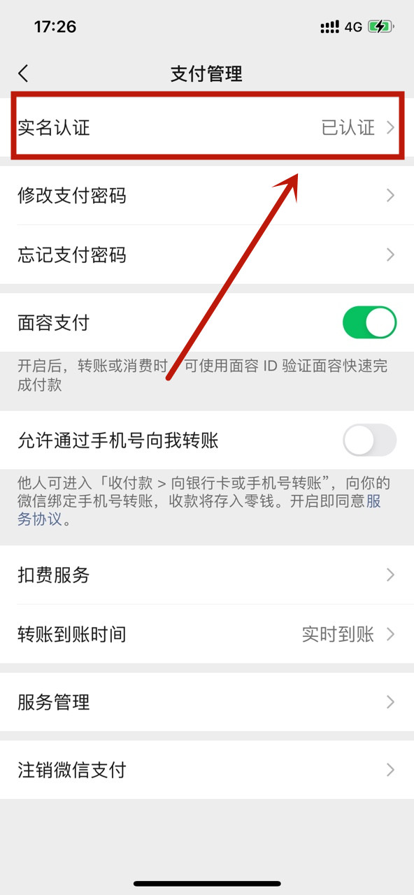 2.然后选择支付管理中的【实名认证】一项,进入查看并修改实名认证信息;