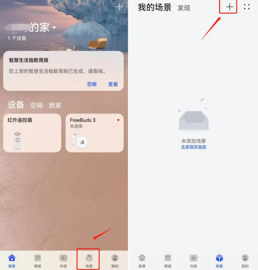 7.打开智慧生活APP,点击场景进入,点击右上角加号