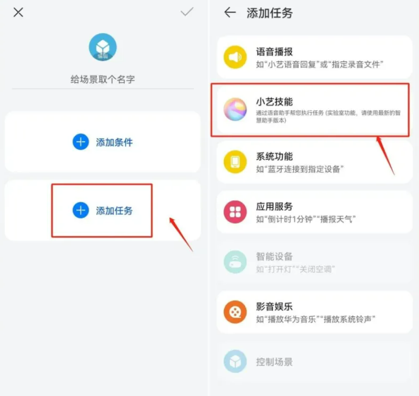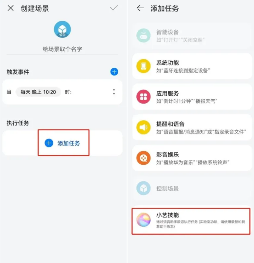 3.点击右上角【+】,选择【添加任务】-【小艺技能】。