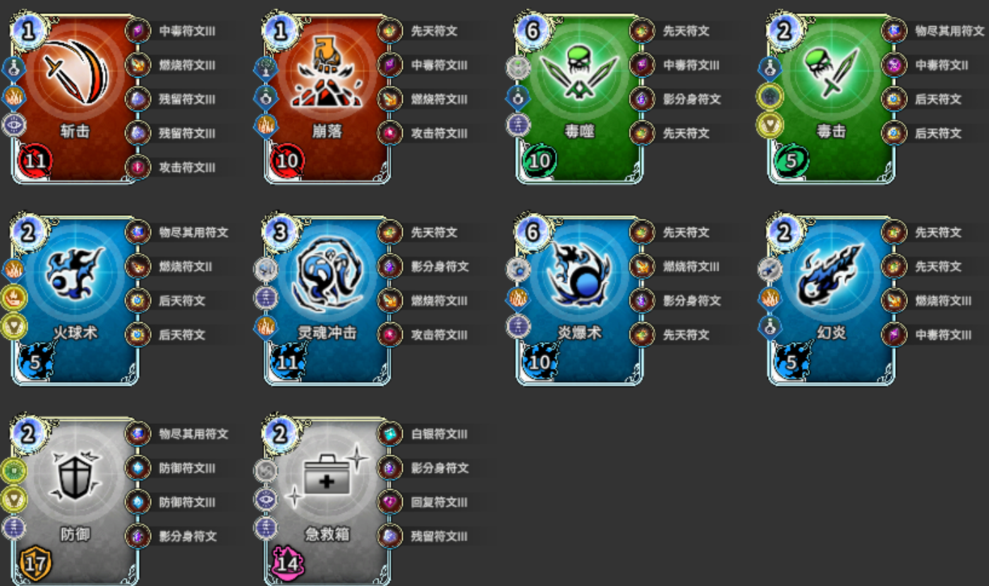 开局先找比较弱的小怪把【毒击】和【火球术】给弃了,然后放【幻炎,斩击,崩落】。【毒噬】叠毒,【炎爆术】叠火,【灵魂冲击】把单个怪的异常给别的怪。路上宝物选异常的基本上无脑推。